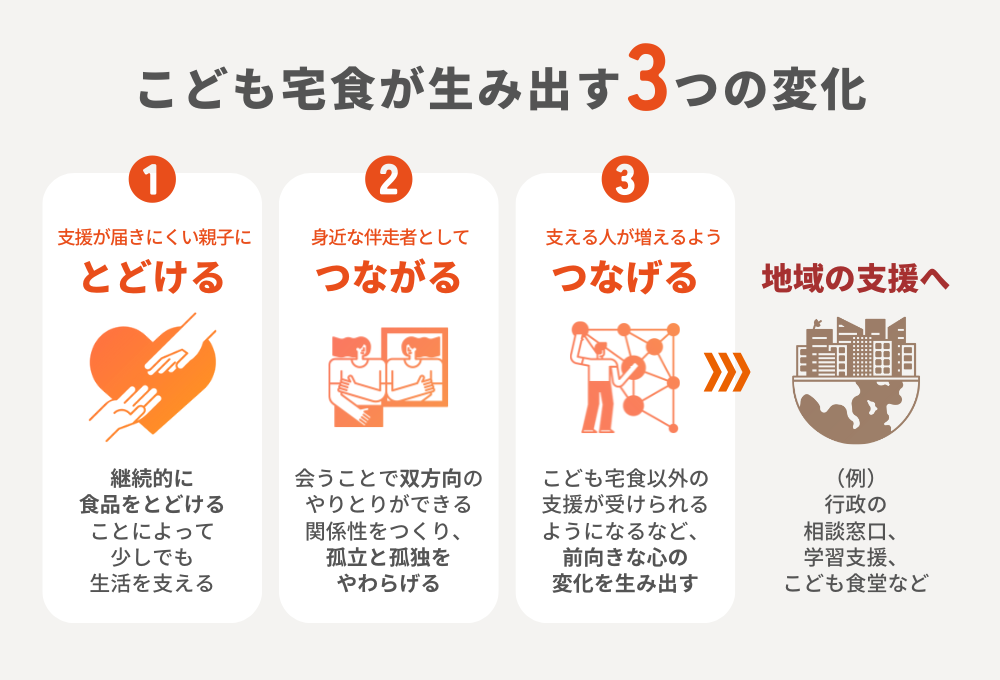 この課題を解決するべく、助けを求める声を待つのではなく、こちらから家庭に出向き直接支援を届ける活動が、つながるアウトリーチの仕組み「こども宅食」です。様々な困りごとを抱えた子育て家庭に、定期的な「食のお届け」を実施し、LINEや配送時の対面によるやりとりから、少しずつ家庭との「つながり」を育てていきます。