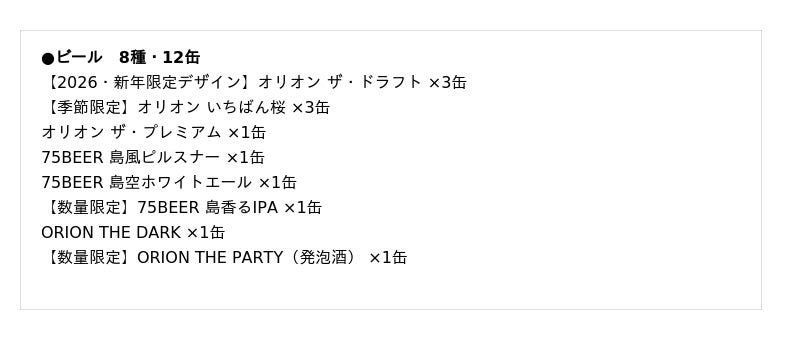 今年のオリオンの福袋は、「2025年の締めくくりと2026年の嘉例を祈願して乾杯!」をテーマに作成しました。来年2026年の干支・午が嘉例(開運)を運ぶ「ザ・ドラフト 2026干支デザイン缶(公式通販限定)」や、沖縄の冬の風物詩「オリオン いちばん桜(季節限定)」、シャンパンのような新感覚テイストの「オリオン ザ パーティー(数量限定)」など、計8種類のバラエティ豊かなオリオンビールの飲み比べがお楽しみいただけます。
