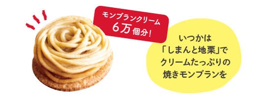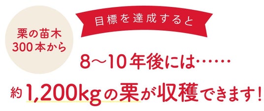 今回のチャレンジで栗の苗木を300本贈ることができれば、およそ7,500平方メートル の栗園が誕生し、8~10年後には約1,200kgの栗が収穫できます。これは四万十ドラマの人気商品「焼きモンブラン」のモンブランクリームに換算すると、約6万個分です。