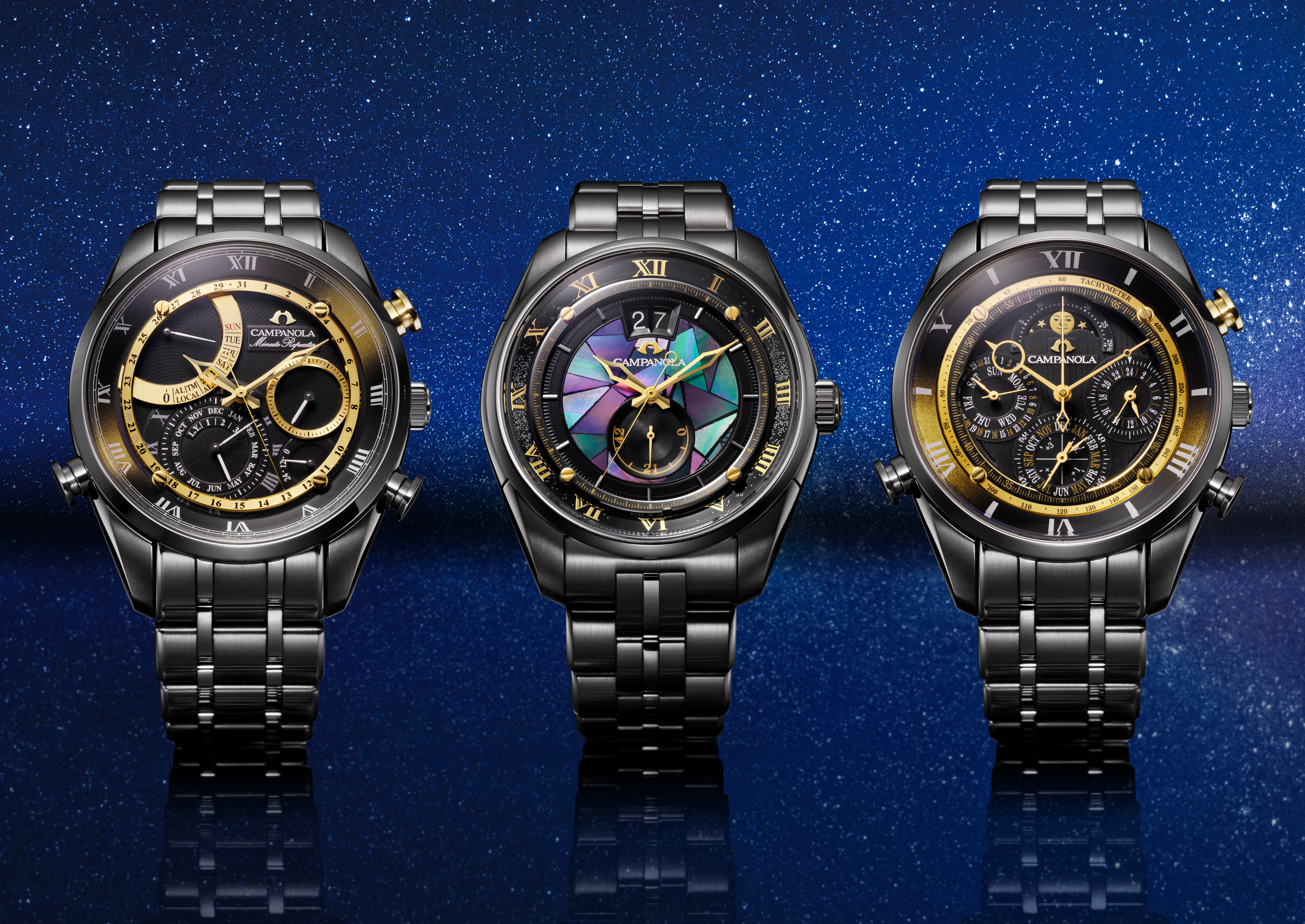 『カンパノラ』25周年記念モデル「星響」左:AH7064-52E 451,000円(税抜価格 410,000円)限定250本、中:NZ0004-57E 1,320,000円(税抜価格1,200,000円)限定150本、右:AH4084-51E 506,000円(税抜価格460,000円)限定250本