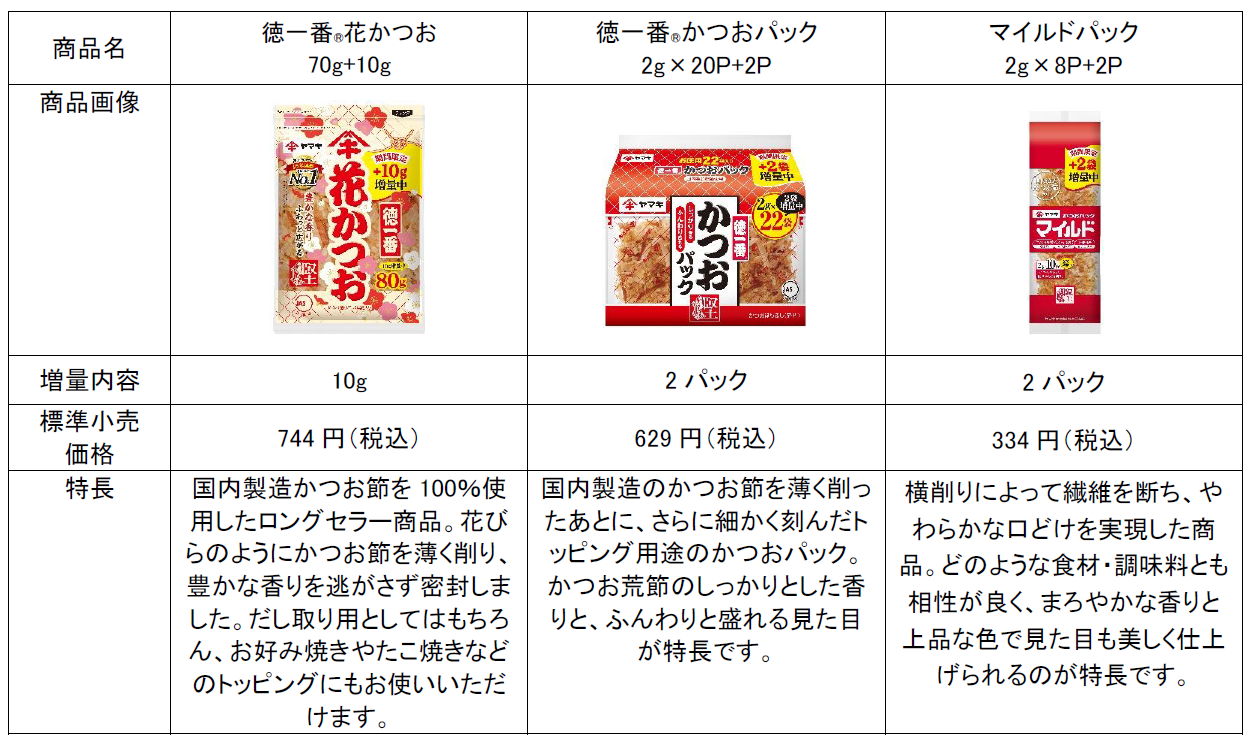 ヤマキ株式会社(本社:愛媛県伊予市 代表取締役社長:城戸善浩 以下ヤマキ)は、2025年11月1日(土)より、「徳一番(R)花かつお70g」「徳一番(R)かつおパック2g×20P」「マイルドパック2g×8P」の3商品を対象に、日頃のご愛顧への感謝を込めた、数量限定の増量企画を実施します。