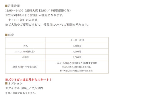 - ズワイガニ食べ放題、ドリンク、追加オーダー、小学生以下のお客様は対象外です。
