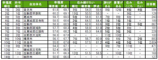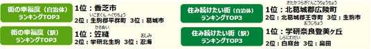 街の幸福度ランキングは、 「全体としてみて、あなたは現在、幸せですか、あるいは不幸せですか」に対して、 1点(非常に不幸)から10点(非常に幸福)までの10段階で評価してもらい、その回答の平均値を10倍して、100点満点に換算。住み続けたい街ランキングは、「今住んでいる街に、ずっと住んでいたいと思う」に対して、 「そう思う」:100点から「そう思わない」:0点までの5段階評価をしてもらい、その回答の平均値で作成。「誇りがある」「愛着がある」も「住み続けたい街ランキング」と同様の方法で作成。