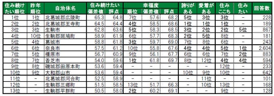 トップ2は2年連続で、1位北葛城郡広陵町、2位北葛城郡王寺町で、トップ2は昨年に引き続き北葛城郡に属する町という結果になっています。3位も2年連続で生駒市です。今年もトップ3は、「住みここち」でも上位3位にランクインしている自治体です。