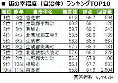 1位は香芝市で、昨年3位から順位を上げました。2位は生駒郡平群町(いこまぐん へぐりちょう)、3位は昨年5位から順位を上げた葛城市です。トップ10内のうち、5自治体が郡部に属する「町」という結果になっています。
