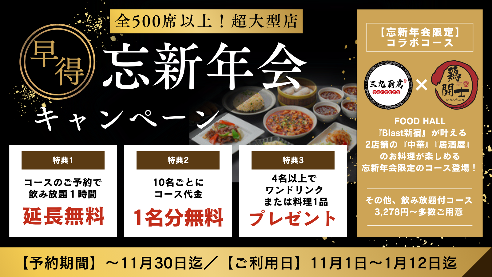 新宿駅徒歩5分。全500席以上、大型FOOD HALL『Blast新宿』内、「鶏闘士 新宿南口店」でお得な忘新年会キャンペーンをを開催中。