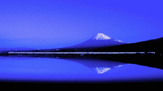 新幹線と富士山。ふたつの「日本一」を1枚に収め、海も川もない区間で、ある方法を使って逆さ富士を表現(東海道新幹線・1990年)。