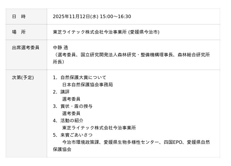 2025年11月12日(水)愛知県今治市にて、日本一の自然保護、生物多様性保全活動を選ぶ「日本自然保護大賞2025」の大賞・教育普及部門を受賞した「東芝ライテック株式会社今治事業所」(愛媛県)の受賞セレモニーを開催いたします。