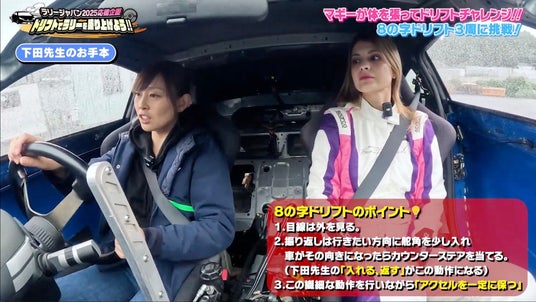 マギーは「第1弾で右回りのドーナツ(定常円ドリフト)を学んだので、左回りのドーナツ(定常円ドリフト)をやってみて、8の字をやろうと思う」と意気込み、いざ運転席へ。すると、難なく左回りの「定常円ドリフト」をこなし、いよいよ「8の字ドリフト」に挑みます。早速苦戦するマギーに対し、下田さんから「今は目線がちょっとパイロンを見過ぎだったんですよ。だからもっと外を見て」とアドバイスが。その通りに実践してみると、マギーは見事成功を収めます。