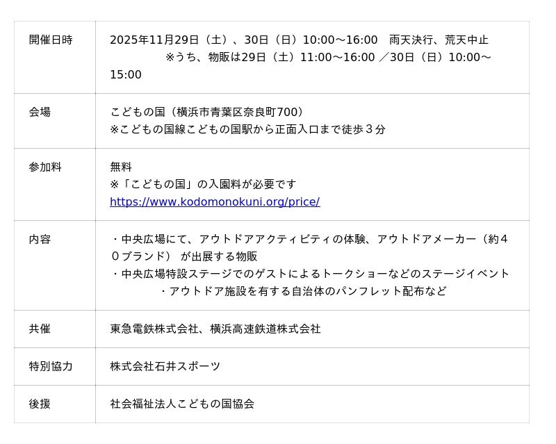 東急電鉄株式会社(以下、「東急電鉄」、本社:東京都渋谷区、取締役社長 福田 誠一)と横浜高速鉄道株式会社 (以下「横浜高速鉄道」、本社:横浜市中区、代表取締役社長 森 秀毅)が、こどもの国線沿線の「こどもの国」において2025年11月29日(土)・30日(日)に開催するアウトドアフェス「ソトアソビチャレンジパーク in こどもの国」(以下、本イベント)の概要をお知らせします。