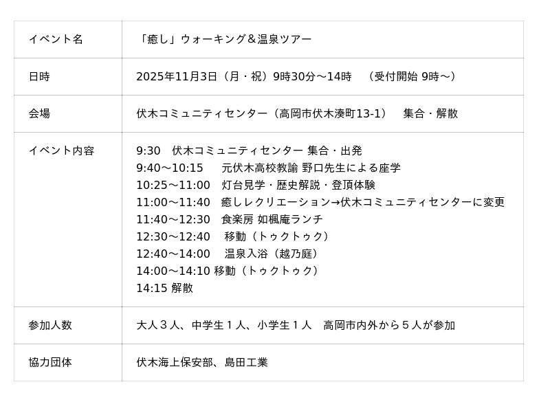 岩崎ノ鼻灯台利活用プロジェクト実行委員会は、11月3日(月・祝)に岩崎ノ鼻灯台を見て学んで体感する「癒し」ウォーキング&温泉ツアーを開催いたしました。このイベントは、日本財団「海と日本プロジェクト」の一環として、灯台を中心に地域の海の記憶を掘り起こし、地域と地域、異分野と異業種、日本と世界をつなぎ、新たな海洋体験を創造していく「海と灯台プロジェクト」の助成を受けて実施したものです。