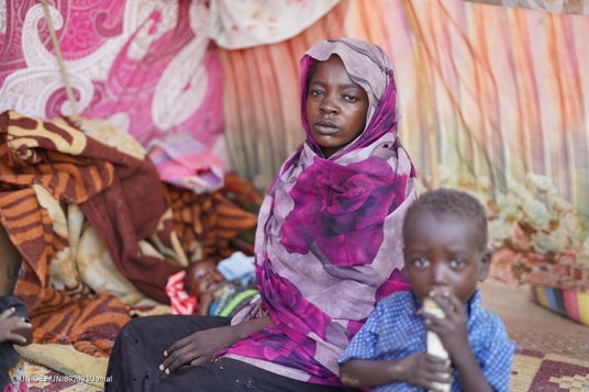北ダルフール州エル・ファーシルから、3人の子どもを連れて、タウィラの避難民キャンプまで逃れてきた母親のナイーマさん(スーダン、2025年11月4日撮影) (C) UNICEF/UNI892693/Jamal
