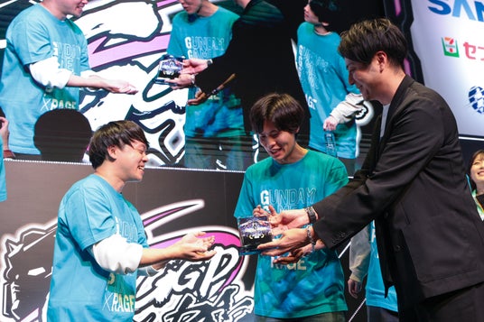 4チームが優勝賞品「GGGP×RAGE オリジナルカラーリングガンプラトロフィー」をかけて戦いました。有名チームの参戦ということで、MCの植田さんは「看板を背負って戦うからこその連帯感があって、チーム感がとてもアップするので、皆さんの気合もすごいと思う。」と戦いへの期待感を話していました。
