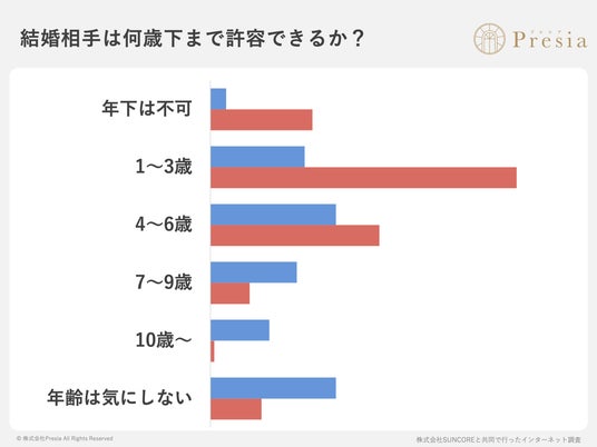 一方で、男性は年上に対しては「1~3歳上」や「4~6歳上」と比較的近い年齢を望むものの、年下に対しては「4~6歳下」、「7~9歳下」、「10歳~」、「年齢は気にしない」と、非常に寛容であることが分かりました。