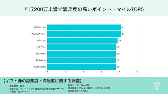 楽天ポイント4.1、PayPayポイント4.1、Tポイント3.9、dポイント3.8、JRE POINT・TikTok Lite・WAON POINTが各3.8(同率)