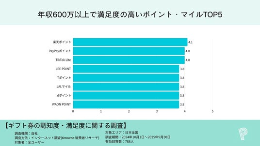 楽天4.1、PayPay4.0、TikTok Lite4.0、JRE POINT・T・JALマイル・d・WAON POINTが各3.8(同率)。
