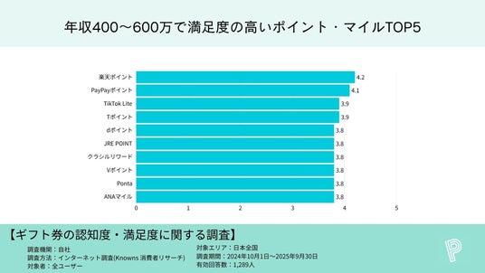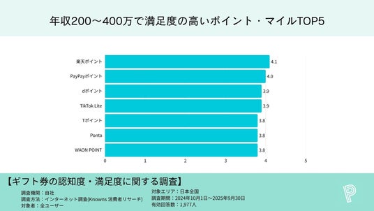 楽天4.2、PayPay4.1、TikTok Lite・T各3.9、d・JRE POINT・クラシルリワード・Vポイント・Ponta・ANAマイルが各3.8(同率)。