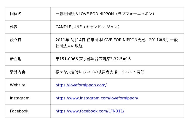 2011年3月11日東日本大震災を受け発足した一般社団法人 LOVE FOR NIPPON (代表:CANDLE JUNE、所在地:東京都渋谷区、以下:LFN)は、「できることは全部やる」を掲げ、様々な支援者と現地を繋ぎ、お互いが笑顔になってもらうための活動をおこなってきました。2024年1月、能登半島沖地震発災の翌日より現地へ入り、炊き出しや物資提供、泥かきなどの支援活動を実施。現在も月命日である毎月1日を中心に仮設住宅などでライブやキャンドルナイトのイベントを開催して、現地の方との交流を続けています。