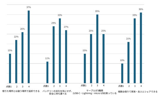 レンタルサービスに最も求められるのは「借りた場所とは違う場所で返却できる」機能(71%が重視)。旅行中の自由な行動を保証し、返却場所を気にせず移動できることが最大の価値。加えて「ケーブルが3種類完備」(62%)により、ケーブル忘れのリスクもなく、家族や友人とも柔軟にシェアできる利便性が、所有型にはない圧倒的な優位性となります。