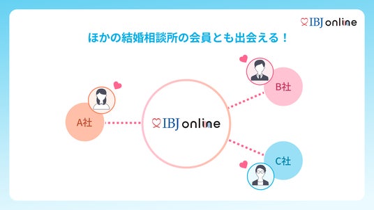 株式会社IBJが運営するオンライン結婚相談所プラットフォーム。「結婚相談所の真剣度」と「マッチングアプリの手軽さ」を両立させ、婚活における多様なニーズに応えます。連携する複数の結婚相談所の会員と出会える豊富な機会と、全会員に独身誓約書提出を必須とした信頼性の高い環境で、日本の婚活市場をさらに活性化させていきます。▽「IBJ online」の詳細はこちら https://www.ibjonline.jp/