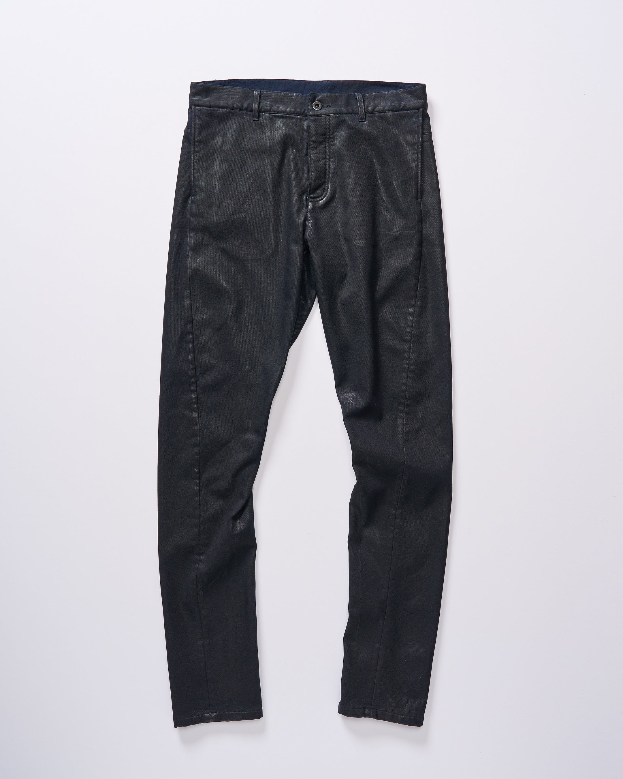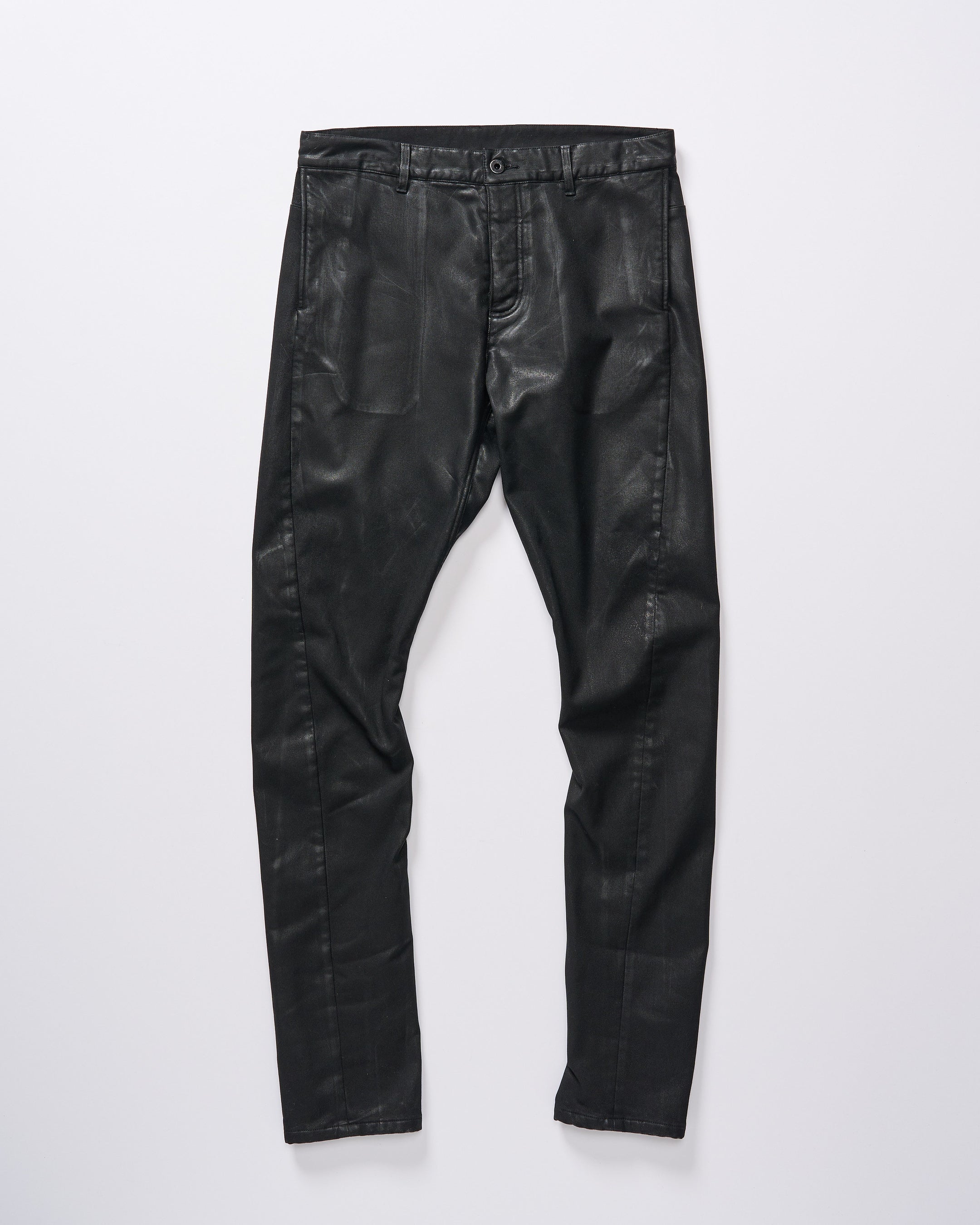 足の可動域を考慮した立体裁断を駆使することでコンフォート性を高めたスリムパンツ。ハードな加工を施すことでwjkらしい無骨なアイテムに仕上げている。特殊なオイル樹脂を3種の配合に分け、それを職人が手作業で塗り重ねることで迫力のあるヴィンテージ感を演出。
