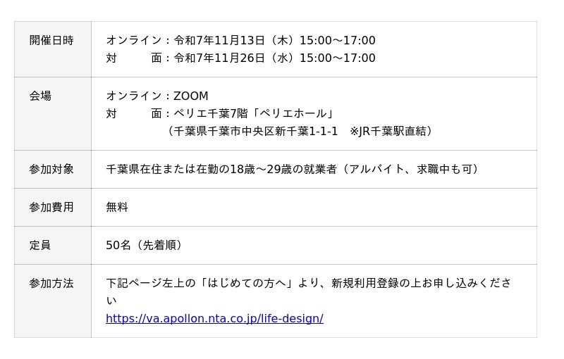 11月13日(木)オンライン、11月26日(水)千葉駅直結「ペリエ千葉」にて実施
