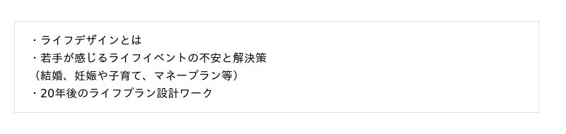 就職や結婚、出産などのライフイベントや、「将来こうなりたい」という思いを、いつ・どのように実現するかを考える「人生設計」のこと。『働く若い世代を対象としたライフデザインセミナー』では、