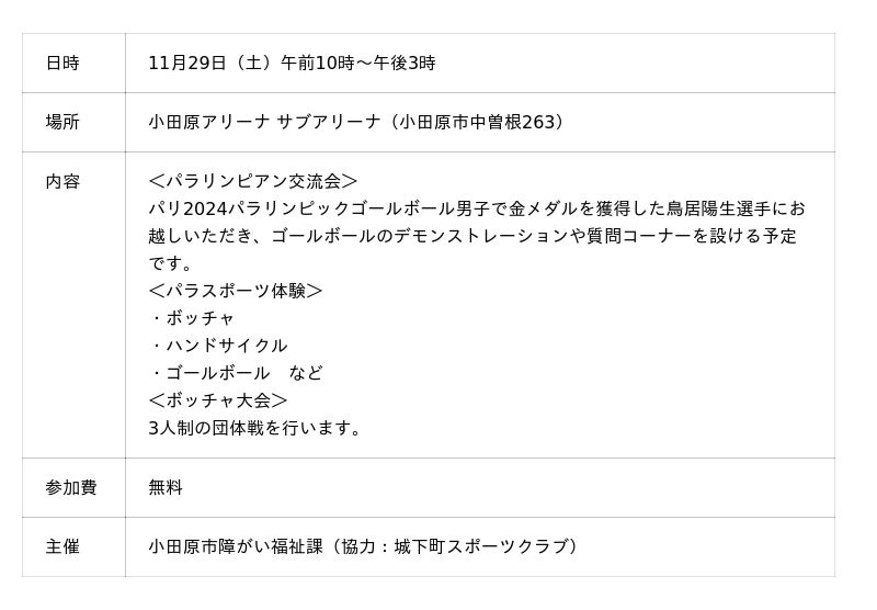 パラスポーツを通じて、パラスポーツの楽しさを実感してもらうとともに、多くの人に障がいについて理解してもらうことを目的に「パラスポーツおだわら」を開催します。