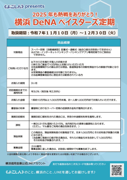 横浜信用金庫(横浜市中区 理事長 春日 隆)は、横浜DeNAベイスターズの2025年の熱戦を称え、期間中に新たに定期預金10万円以上お預入れいただいた方を対象として、「2025年も熱戦をありがとう!横浜DeNAベイスターズ定期」の取扱いを開始します。