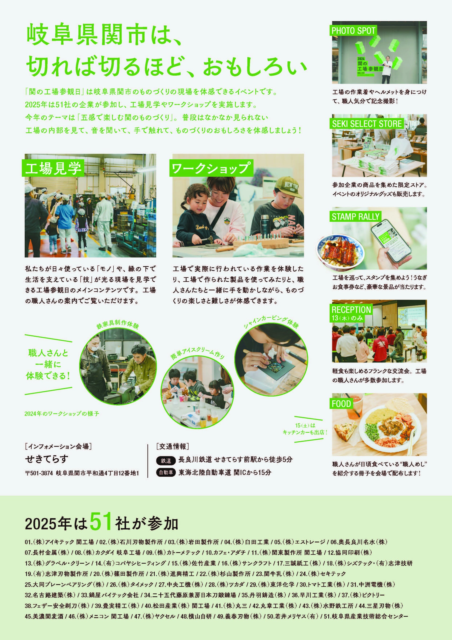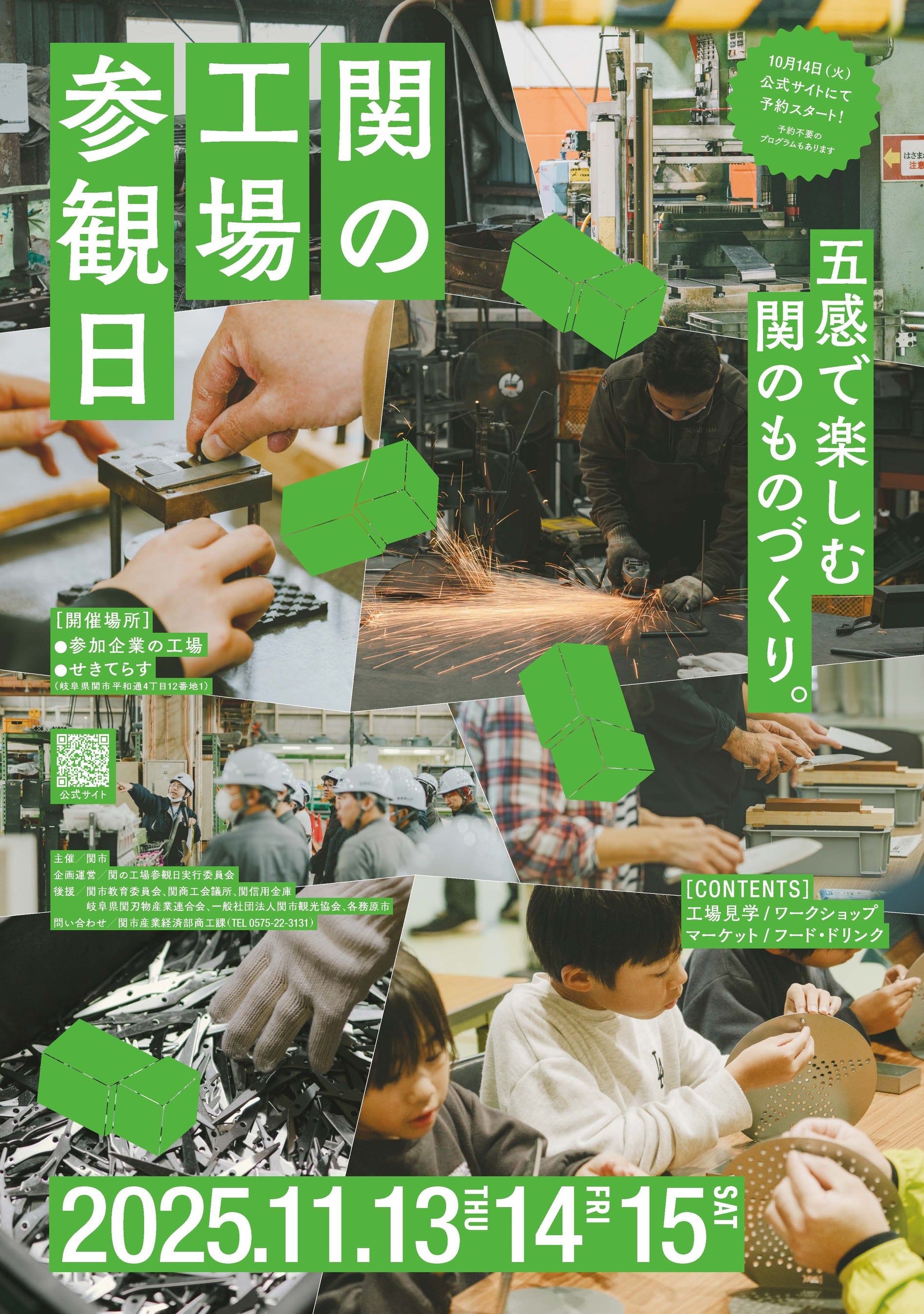2025年11月13日(木)~15日(土)に、“刃物のまち”として知られる岐阜県関市でものづくりの現場を見学・体験できるイベント「関の工場参観日」を開催します。12回目となる今年は51企業が工場見学やワークショップを実施し、普段は見ることのできない、ものが生まれる瞬間に触れることができます。そのほか、バスツアーやデジタルスタンプラリー、グルメ、お買い物、フォトスポット、レセプションイベントなどコンテンツが盛りだくさん。ものづくりの面白さを見て、触れて、五感で体験することができます。