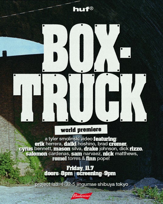 HUF Harajuku Storeでは、11月7日(金)、「HUF」スケートチームライダーが総出演の“Tyler Smolinski” の新作ビデオ『Box-Truck』ジャパンプレミアを開催します。