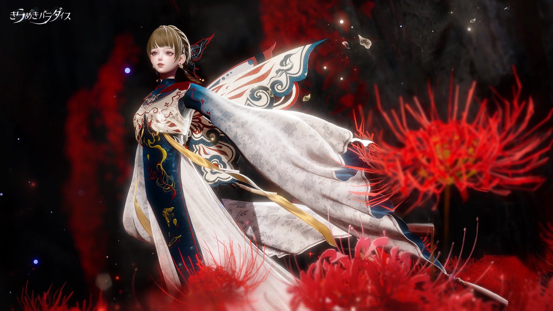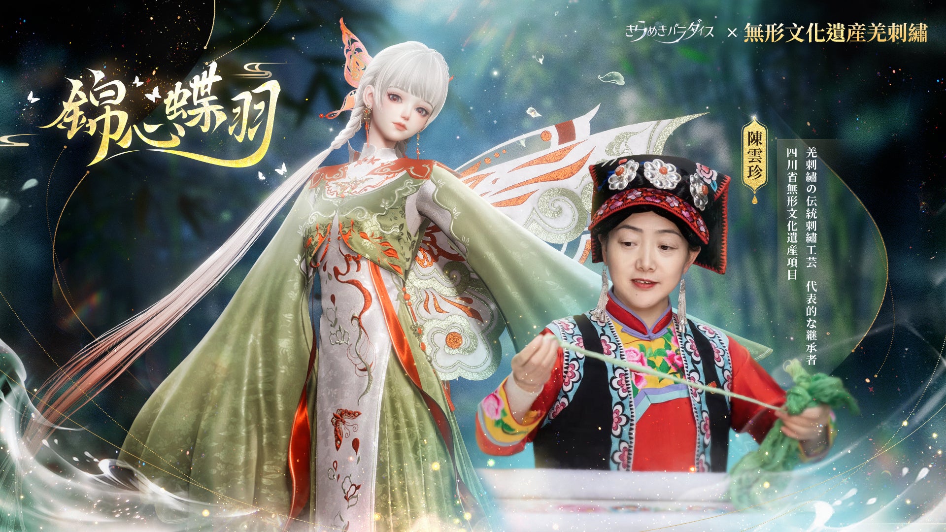 今回登場する星5セット「錦心蝶羽」の制作において、陳先生は開発チームと力を合わせ、幾度にもわたる創作のぶつかり合いを経て、吉祥・変化・永遠の美を象徴する「蝶恋花」の文様を、繊細かつ丹念にドレスのデザインへ融合させました。これは陳先生が『きらめきパラダイス』の皆様に託した、真心がこもった想いと願いでもあります。