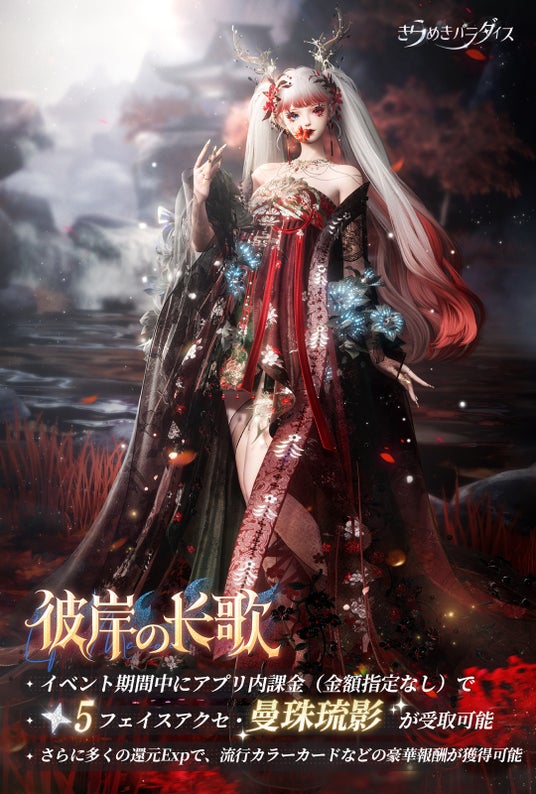 イベント期間中、ゲーム内または公式サイトから任意の金額をチャージをすると、「彼岸の長歌」画面にて星5限定フェイスアクセ『曼珠琉影』を受け取れます。