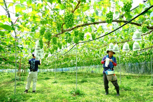 井上農園の畑は、内子町の山あいに位置し、標高約200メートルの見晴らしのよい土地にあります。昼夜の寒暖差が大きく、日当たりと水はけにも恵まれた、果実づくりに理想的な環境です。堆肥を活かした土づくりを重ねながら、木や花穂、果粒の状態を丁寧に見極め、自然の力を最大限に引き出す栽培を続けています。こうして育まれるシャインマスカットは、芳醇な香りと上品な甘みを併せ持ち、果肉が締まった高品質な果実に実ります。