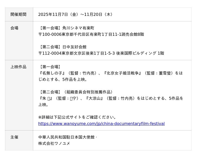 本映画祭はドキュメンタリーを通じて中国の“今”を伝え、長期取材に基づくドキュメンタリーの価値を再確認すること、また日中文化交流の促進や専門家・文化関係者を招いた交流・共有の場づくりを目的として中華人民共和国駐日本国大使館と株式会社ワノユメ主催で開催されます。