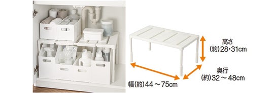 ご自宅の洗面台下スペースに合わせて、幅は44cm~75cm、奥行は32cm~48cmの間で自在に調整可能。高さは28cmと31cmの2段階で設定でき、収納する物のサイズや量に合わせて使い分けができます。