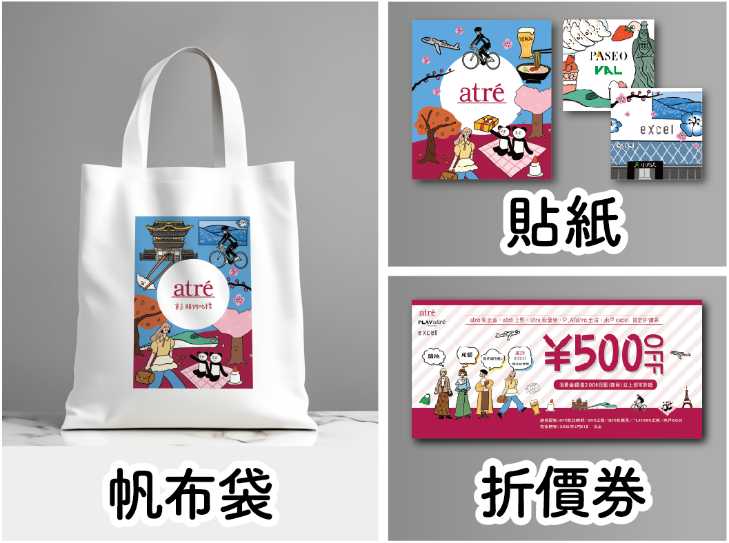 アトレブースにご来場いただき、アンケートにご回答いただいた皆様に、アトレ・パセオ・バル・エクセルオリジナルノベルティグッズをプレゼントいたします。今回のために、台湾人イラストレーターの方に書き下ろしていただいたイラストを使用したトートバッグやステッカーに加え出展7館限定で使用できるクーポン券を配布予定です。・景品等が無くなり次第終了