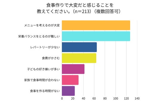 食事づくりで大変だと感じる点については、「メニューを考えるのが大変」(28.6%)と「栄養バランスをとるのが難しい」(28.6%)がともに最多で、合わせて57.2%の保護者が日々の献立や栄養面の工夫に悩んでいることがわかりました。