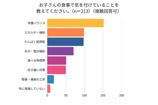 子どもの食事において保護者が特に意識している点としては、「栄養バランス」(27.8%)が最も多く、「エネルギー補給」(18.1%)、「たんぱく質摂取」(18.0%)、「水分・塩分補給」(13.0%)が上位を占めました。