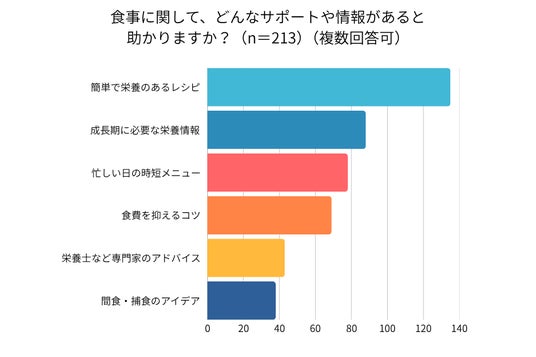 食事面で求めるサポートや情報としては、「簡単で栄養のあるレシピ」(35.1%)が最も多く、次いで「成長期に必要な栄養情報」(22.9%)、「忙しい日の時短メニュー」(20.3%)が続きました。