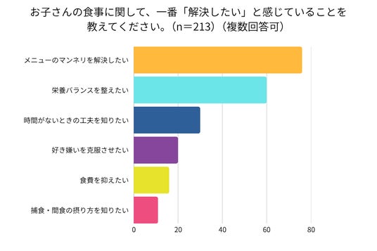 さらに、子どもの食事に関して「最も解決したいこと」としては、「メニューのマンネリを解消したい」(35.7%)が最多であげられました。