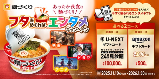 東洋水産株式会社(本社:東京都港区、社長:住本憲隆)が2025年11月10日(月)から開始するキャンペーン「あったか夜食は麺づくり!フタをめくれば、エンタメキャンペーン」において、「U-NEXTが24時間見放題」のギフトコードをプレゼントすることが決定いたしました。