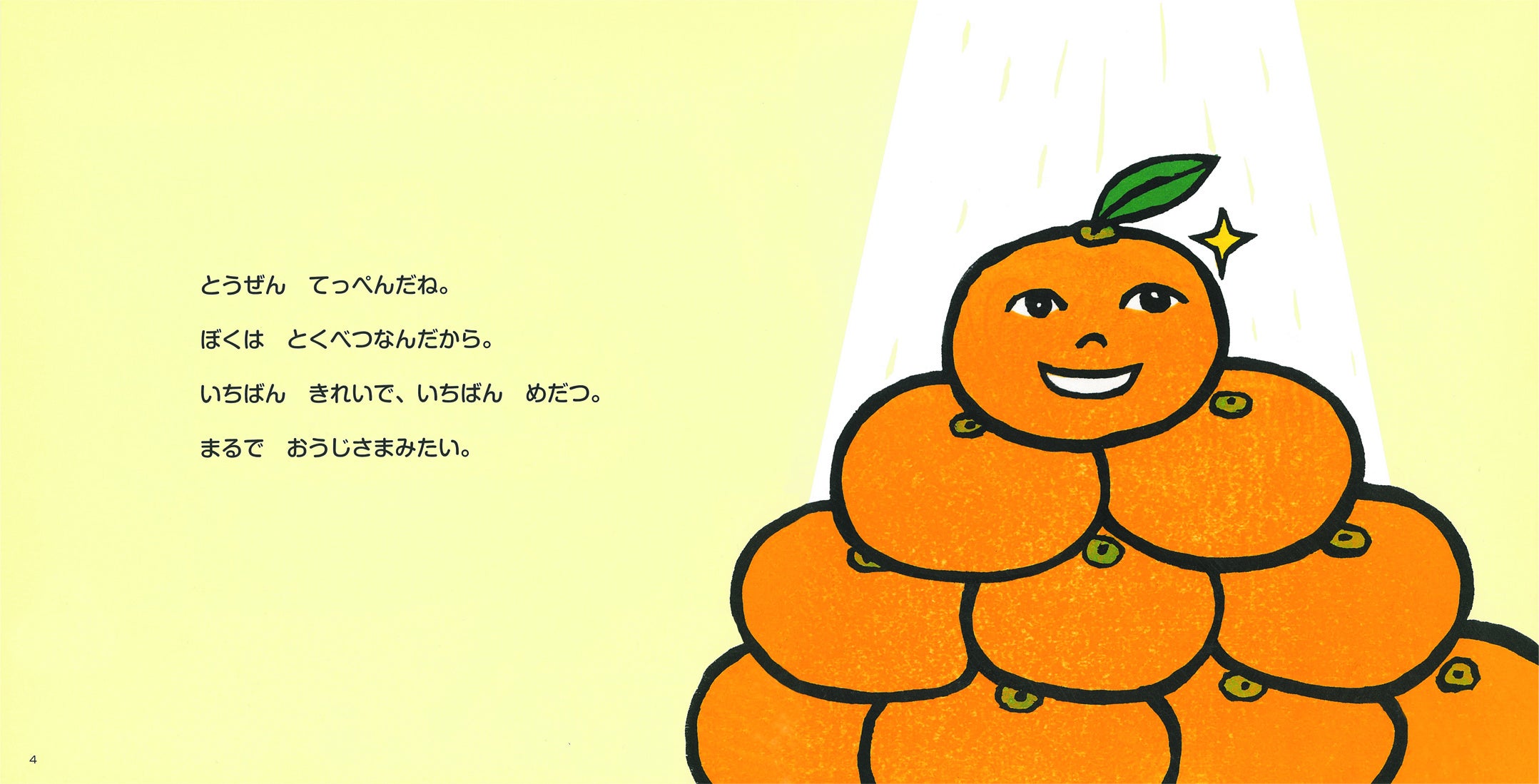 たくさんのみかんの中で、ぼくだけ、りっぱな葉っぱがついているんだ。どうだい、すてきでしょ?