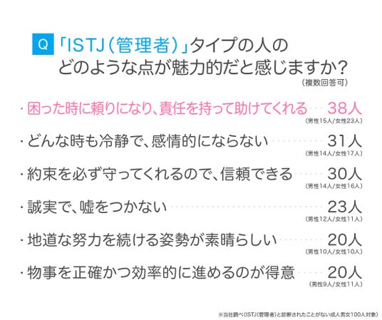 続いて、「ISTJ(管理者)と診断されたことがない成人男女100人」にISTJ(管理者)の魅力について尋ねたところ、以下のような回答が集まりました。