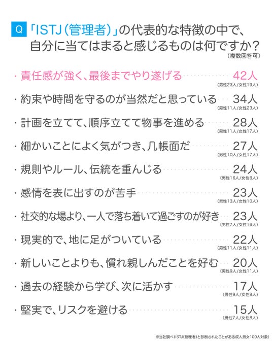 今回のアンケート調査から、ISTJ(管理者)は、「真面目で責任感が強く、信頼できる」というイメージを周囲から持たれていることが分かりました。