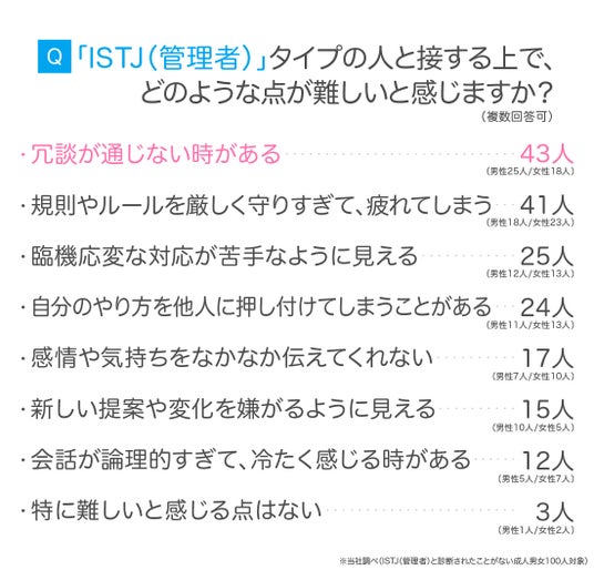 続いて、ISTJ(管理者)と接する上で難しいと感じる点についても質問しました。