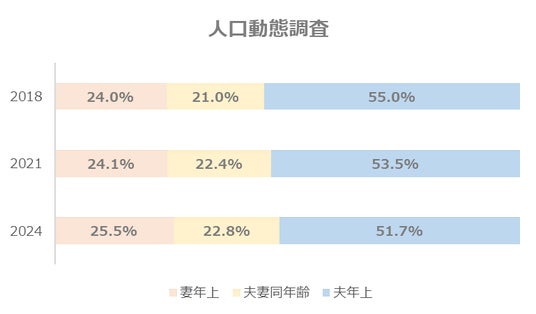 人口動態調査では「25.5%が妻年上婚」という結果に対し、結婚相談所では18.0%と、依然として夫年上の割合が高くなっています。