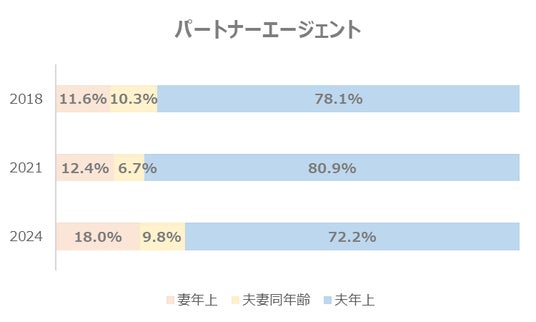 人口動態調査における妻年上婚は2018年の24.0%から2024には25.5%と1.5ポイントの増加となりました。一方、パートナーエージェントでは2018年の11.6%から2024年には18.0%へと6.4ポイントも増加しており、結婚相談所の方が妻年上婚のニーズを顕著に反映する結果となりました。
