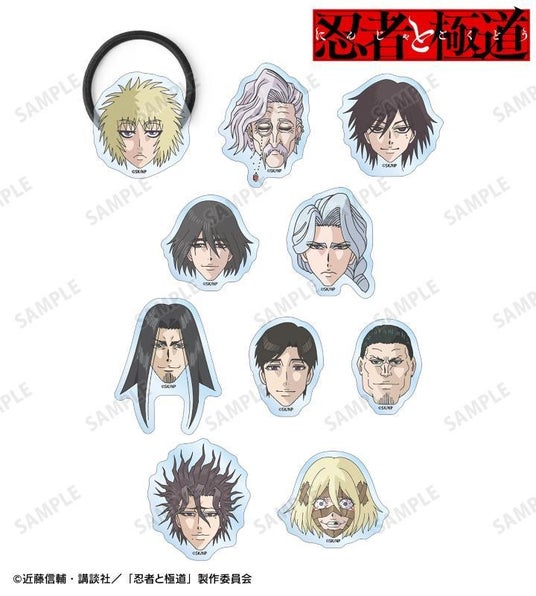 多仲 忍者、璃刃 壊左、神賽 惨蔵、祭下 陽日、覇世川 左虎、邪樹 右龍、輝村 極道、夢澤 恒星、殺島 飛露鬼、ガムテのイラストをアクリルヘアゴムに仕上げました。
