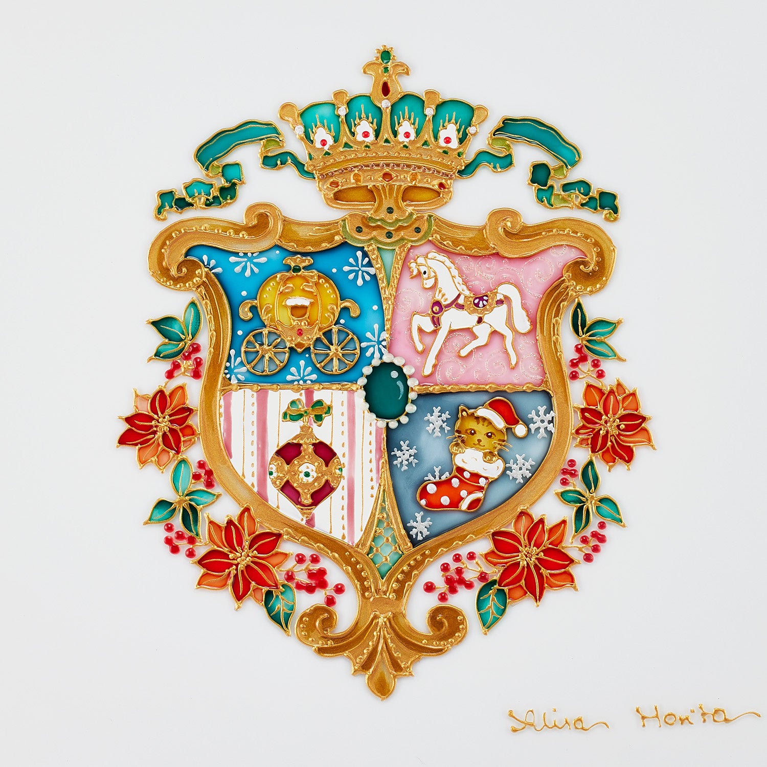 クリスマスソックスにすっぽり入った子ネコサンタに、王冠、白馬やかぼちゃの馬車をあしらった『クリスマスのエンブレム』。エンボス加工でぷっくりと浮き上がり、光が当たるとゴールドが艶やかに輝きます。
